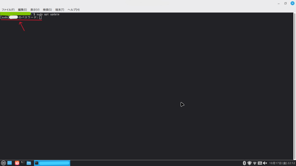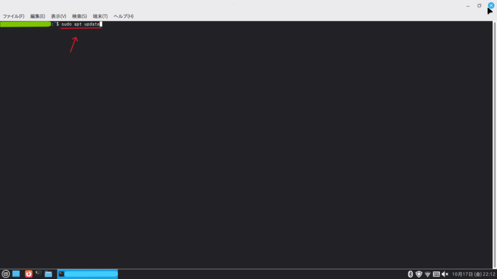 1.まずは端末(ターミナル)を開き、以下のコマンドを入力します。