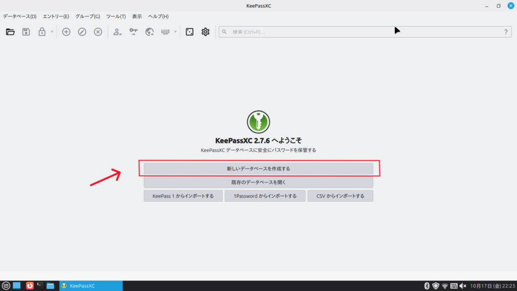 1.KeePassXC を起動して、「新しいデーターベースを作成する」をクリックする。