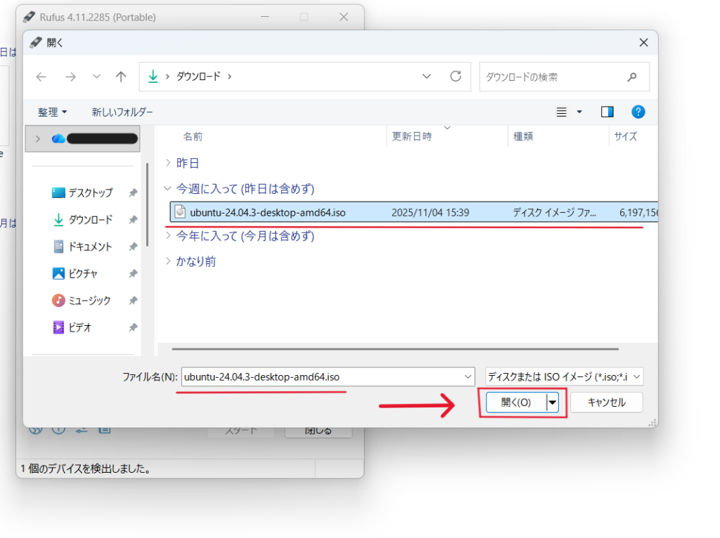 3.ダウンロードしておいたISOファイルを選択。「開く」をクリックする。